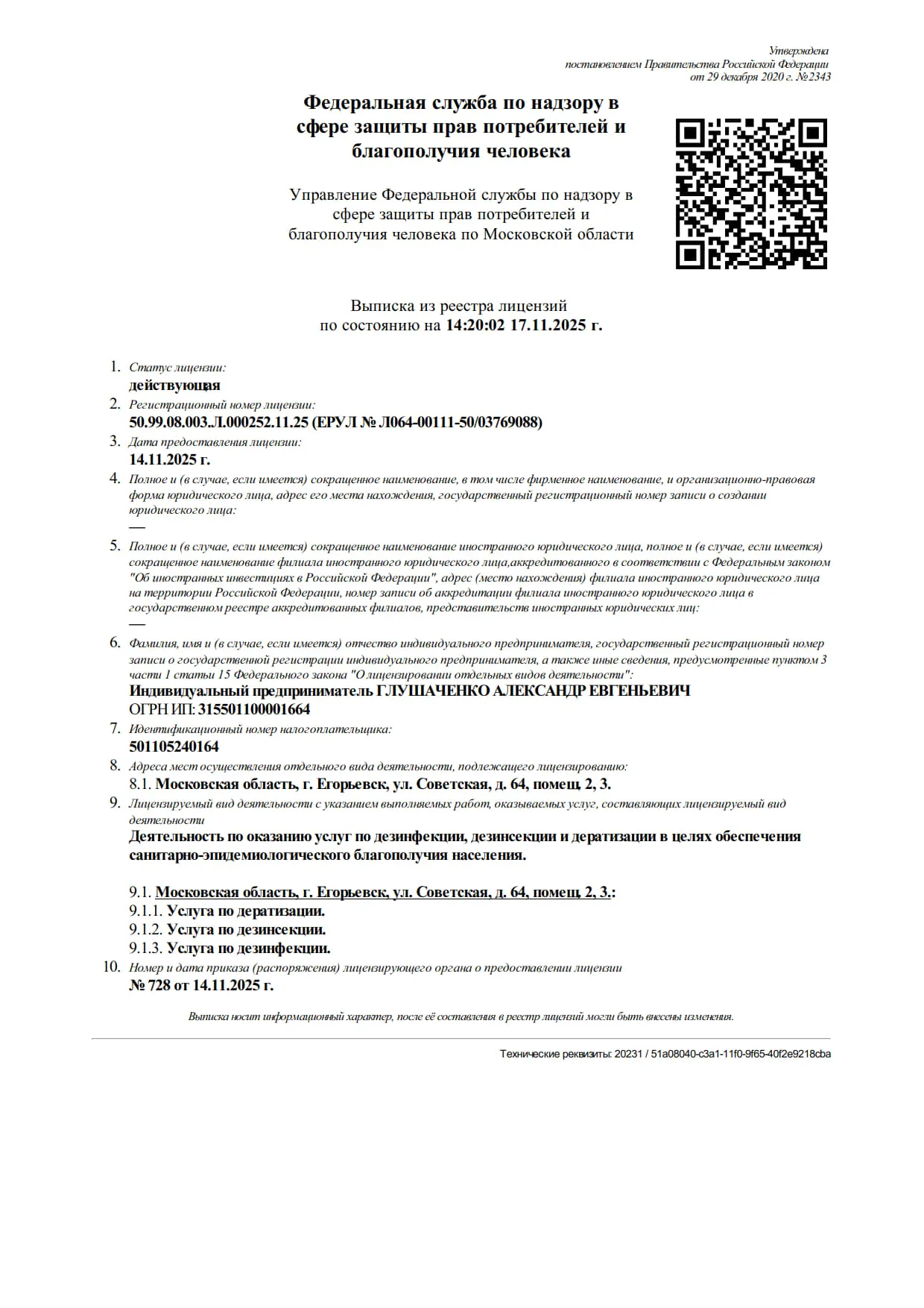 Официальная выписка из реестра лицензий Роспотребнадзора